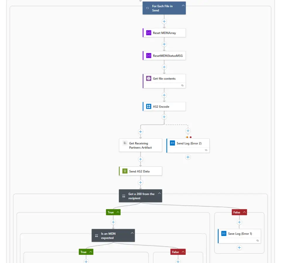 - A Logic App to Send AS2 Files – On a set interval will get files from a “Send” folder on our storage account, encode and transmit the AS2 data and store and MDN receipt if one is provided by the parter.